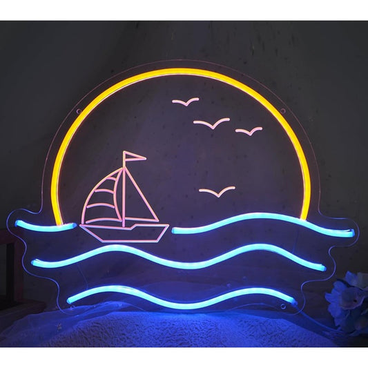 Lovely Bright Pink Little Sail Boat on the Sea w/ Sunset LED NightRoom Wall Deco