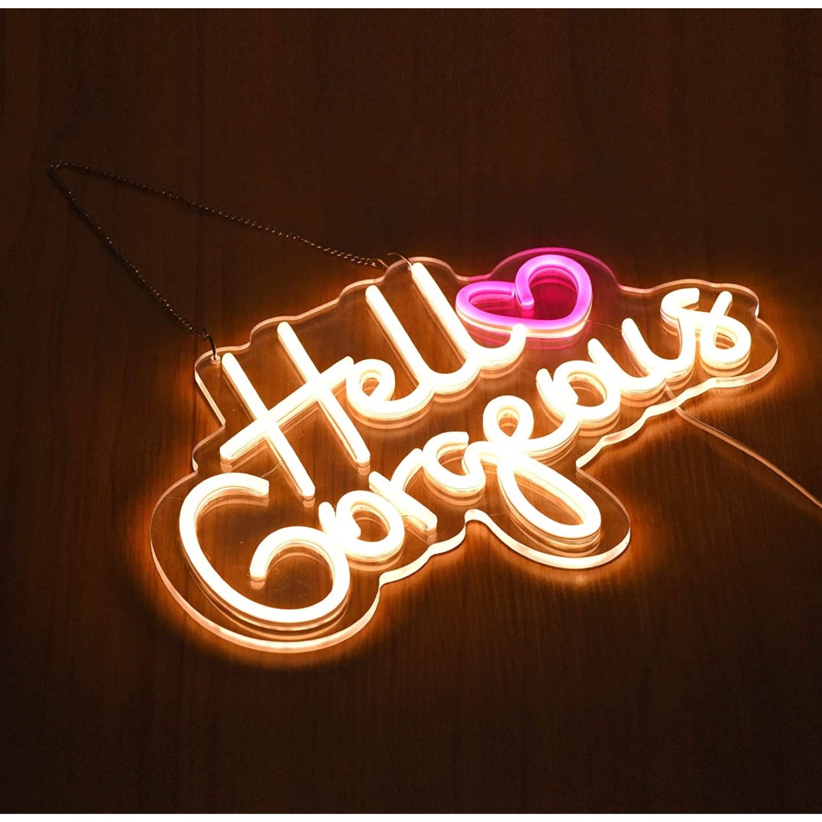Hello gorgeous neon sign is made by flexible silicon LED strip lights and fixed on an acrylic clear board