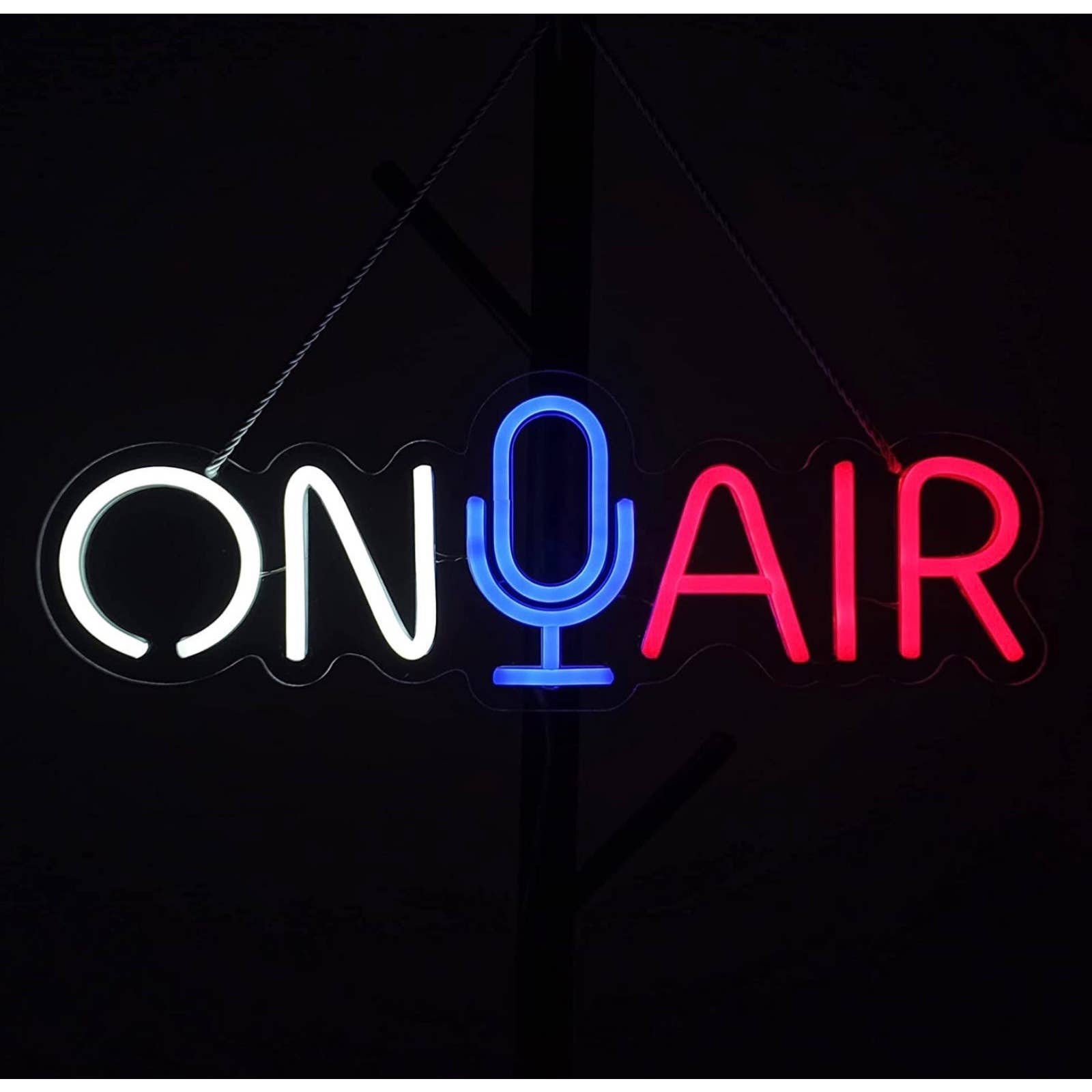 ON AIR Neon has an on/off switch button, there are two small holes on the top of the sign, you can use the included chain to hang it on the wall or shelf.