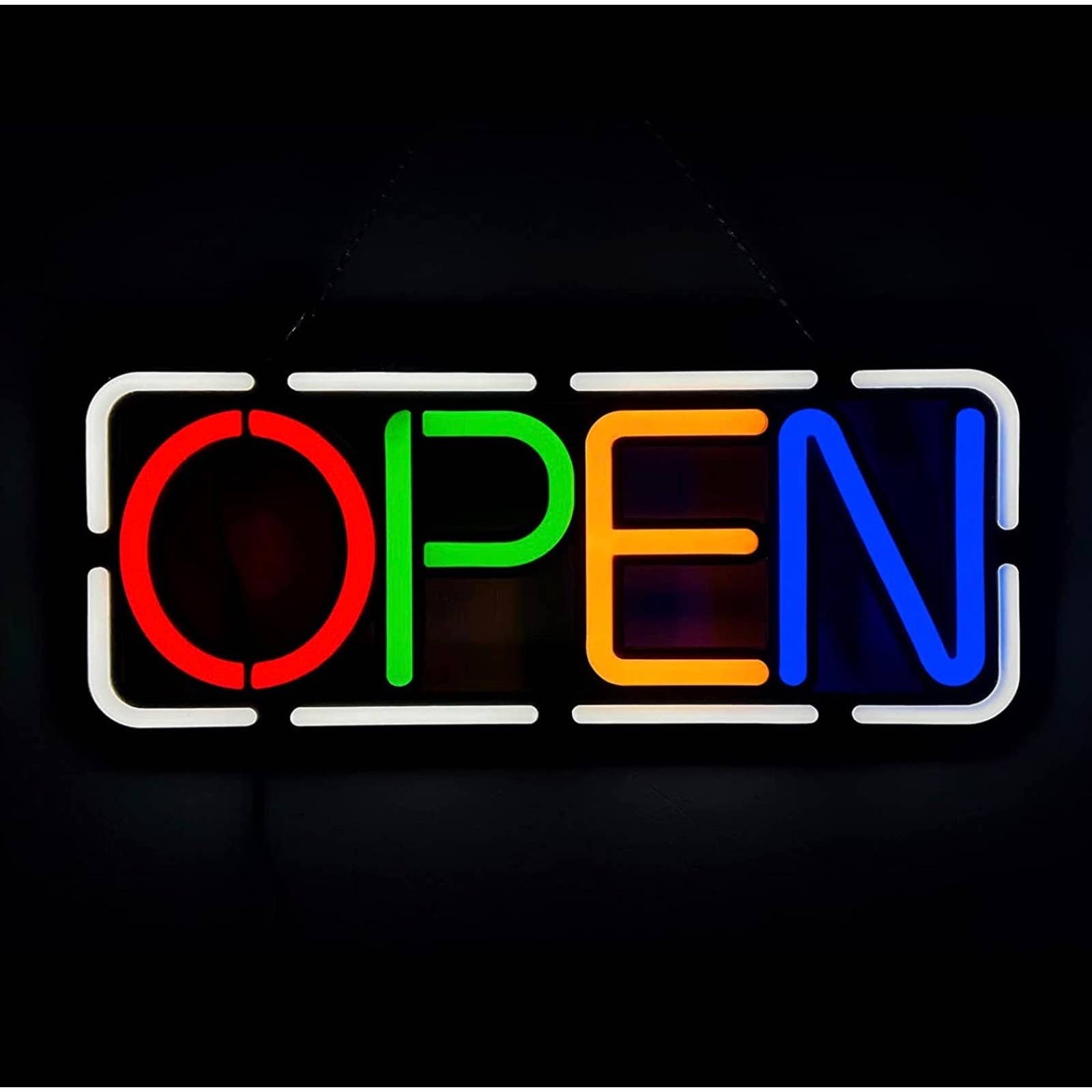 Striking and Energy-saving: Uses the ultra-bright LEDs, Whether it's day or night, it's eye-catching. The 18W output LED neon open sign is matched with a 24W power adapter with high efficiency. Low temperature and 100,000 hours long service life.