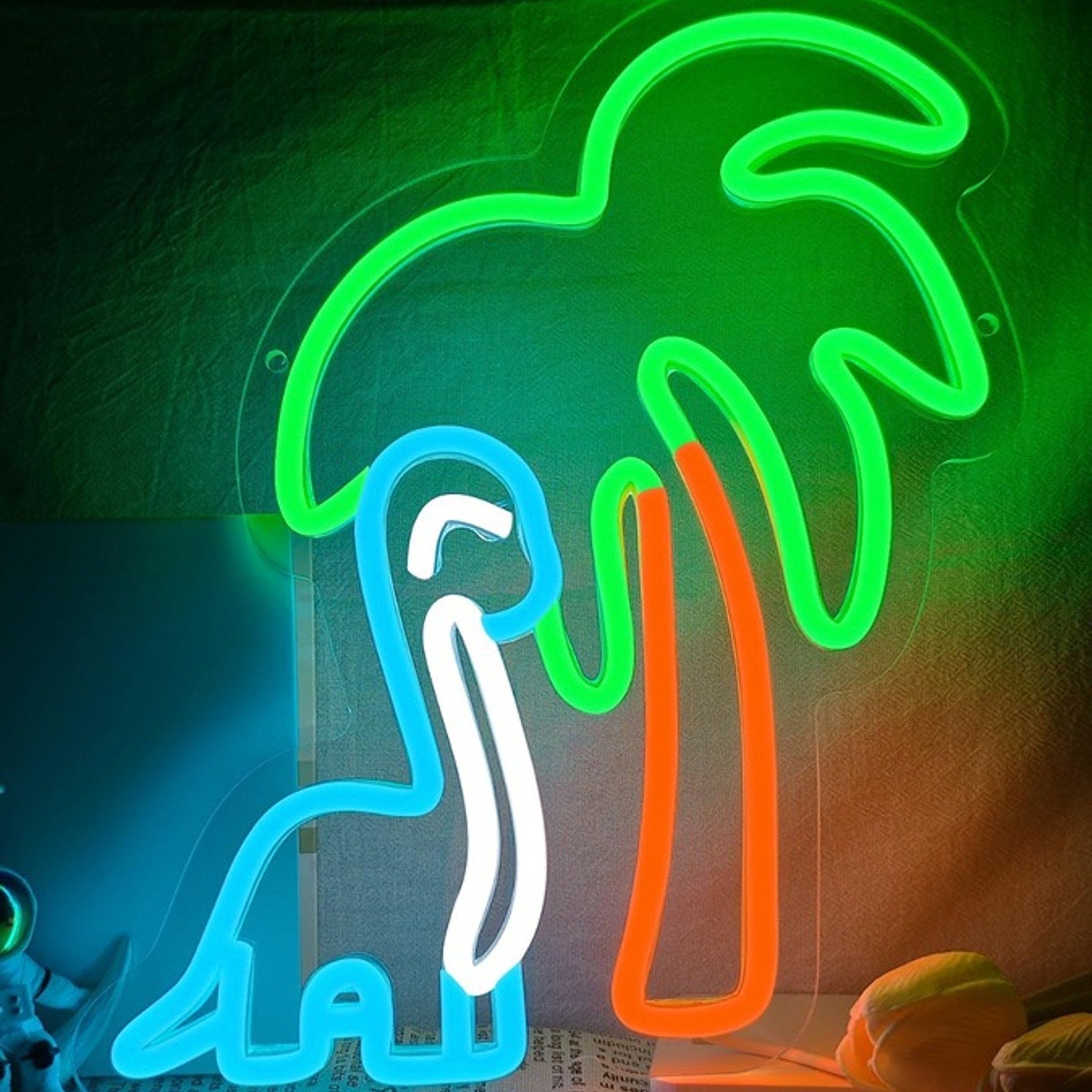 Bring prehistoric vibes to any space with this fun and colorful blue dinosaur LED night light! Featuring a playful dinosaur standing next to a vibrant palm tree, this wall decor is perfect for kids’ rooms, playrooms, or dinosaur-themed spaces.
