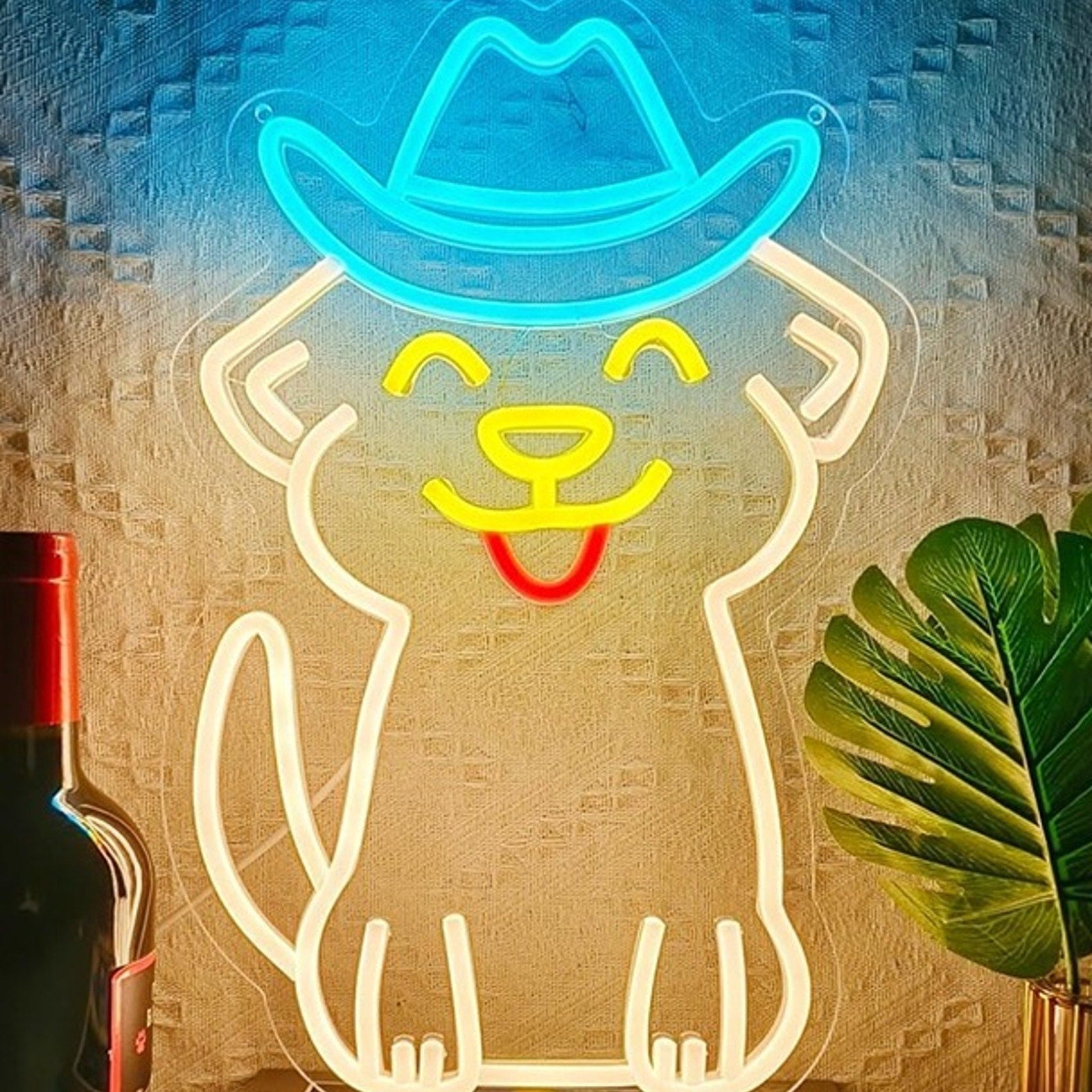 Bring a paw some western vibe to any space with this Bright Cute Puppy Dog in a Blue Cowboy Hat LED night light! Perfect for dog lovers and cowboy fans, this glowing sign adds a playful and charming touch to any room.