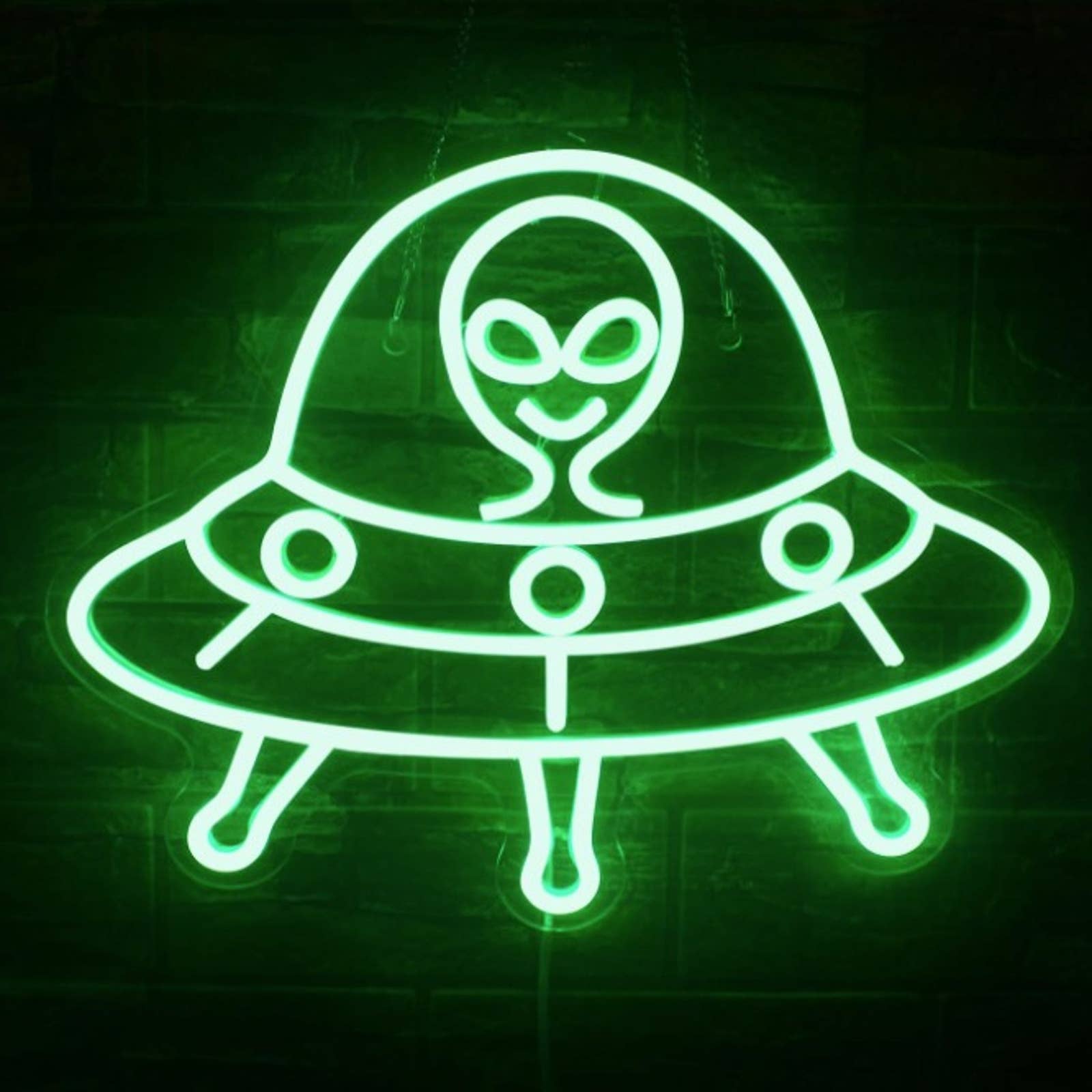 Elevate your space with the mesmerizing Alien Spaceship Neon Sign. Featuring vibrant green neon lights illuminating a intricately designed UFO spaceship, this sign adds an otherworldly touch to any room.