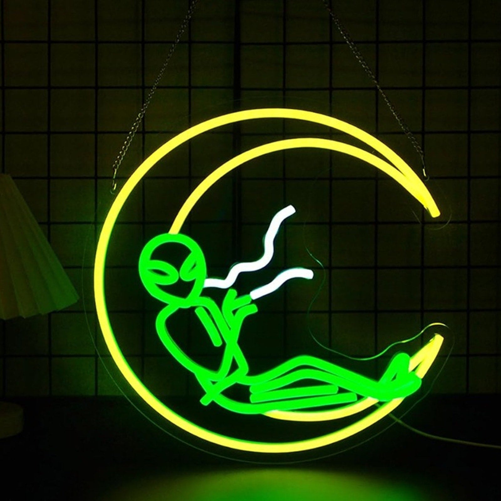 Fun Bright Green Alien Sitting on a Crescent Moon Night Light Room Wall Decor