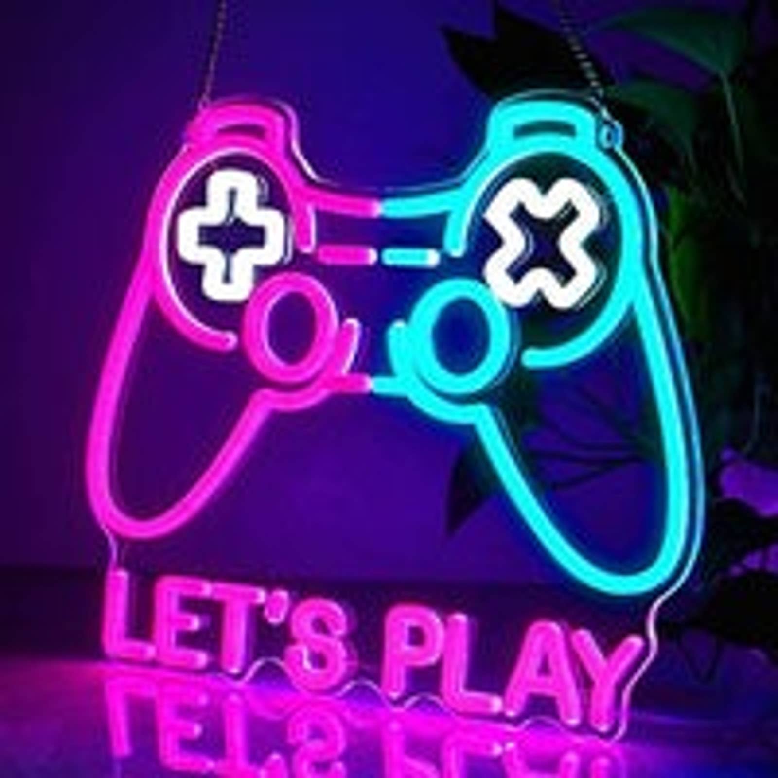 Let's Play Game Neon Sign: Elevate your gaming space with this vibrant Let's Play video game controller neon light. The bright pink and blue colors bring energy and excitement to any room.