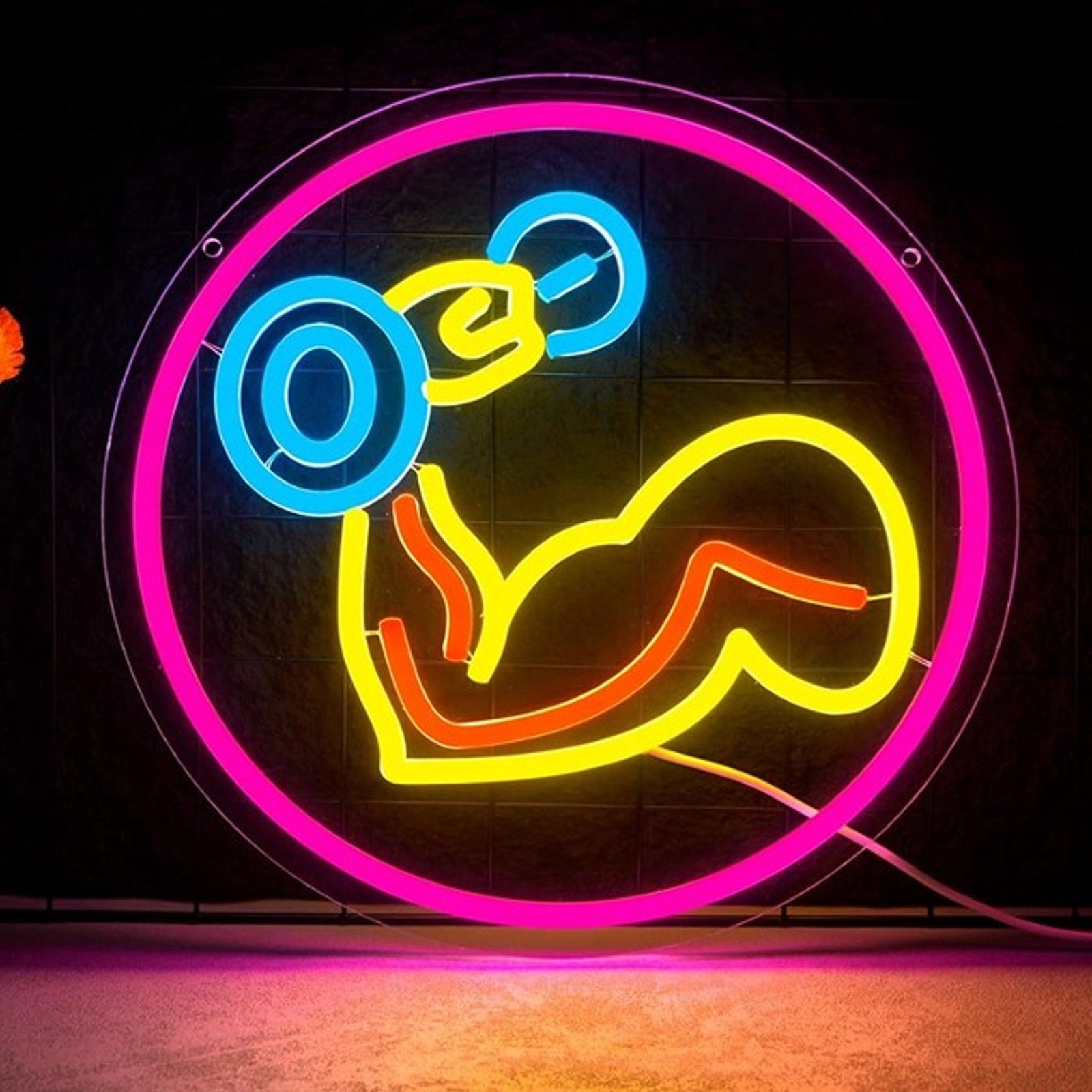 Fun Bright Pink Circle Strong Arm Dumbbell Fitness LED Light Gym Exercise Wall Decor