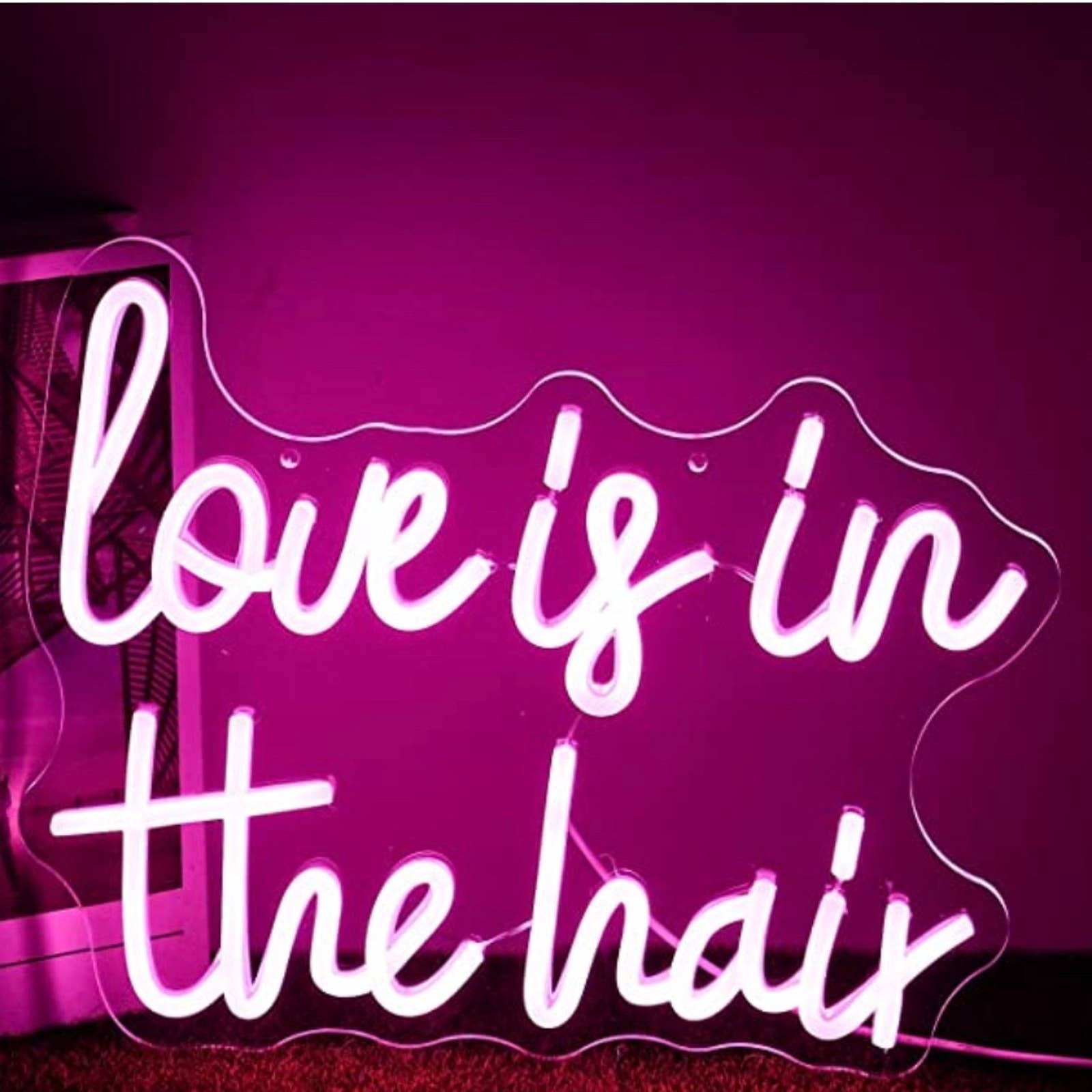 Adjustable brightness: The Love is in the Hair neon sign has three buttons. The middle control switch and up and down buttons can adjust the brightness. (10% - 100%) USB cable length: 59 ". Enough length can be placed anywhere in the shop. pink neon light is brighter and warmer than the original neon light.