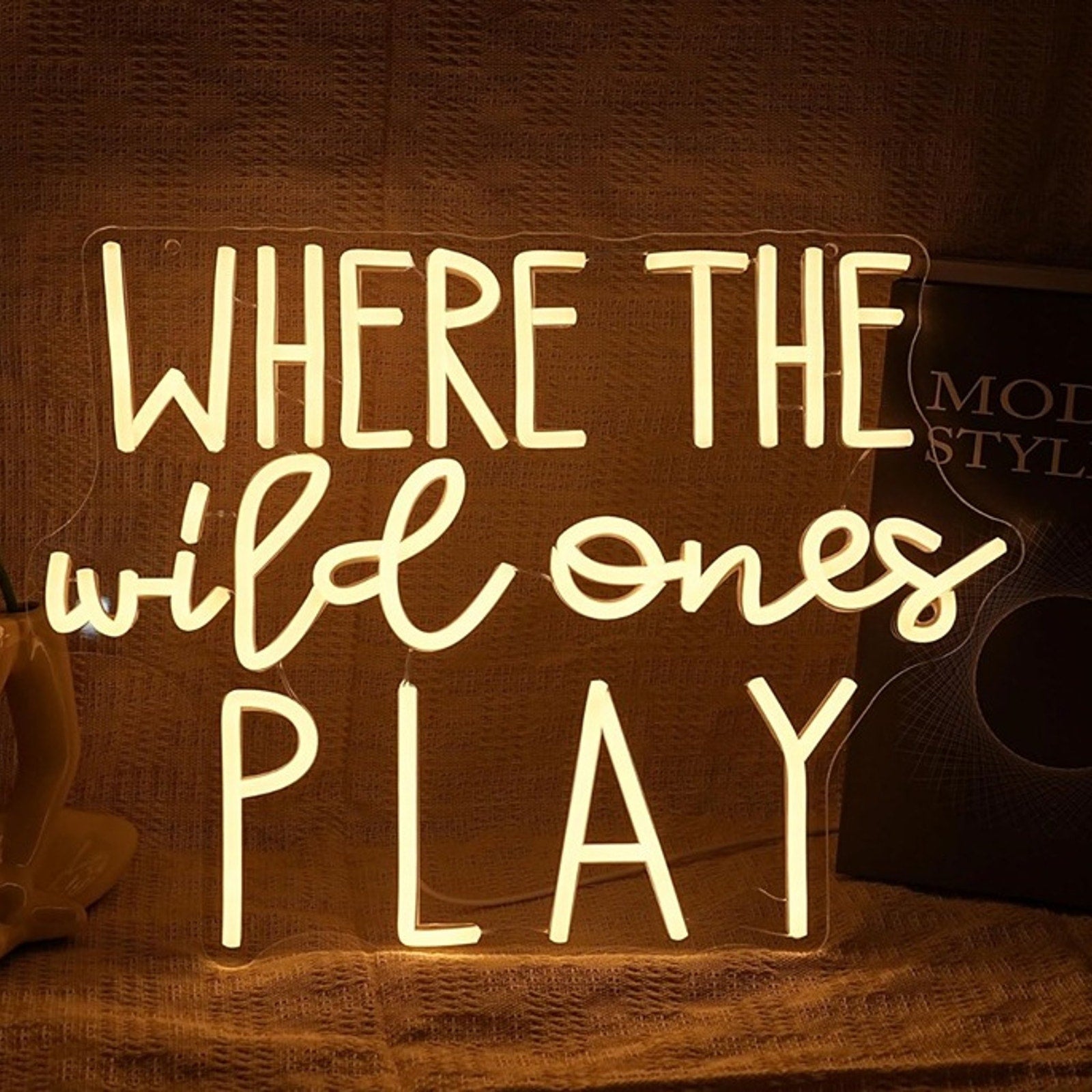Create a cozy adventure zone with this fun warm bright “Where the Wild Ones Play” LED night light! Perfect for free spirits and imaginative minds, this glowing sign brings warmth and wild wonder to any playful space.