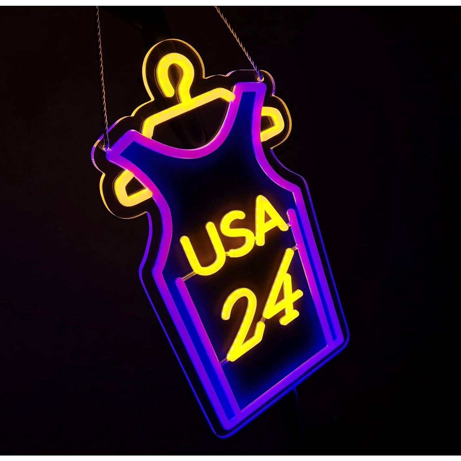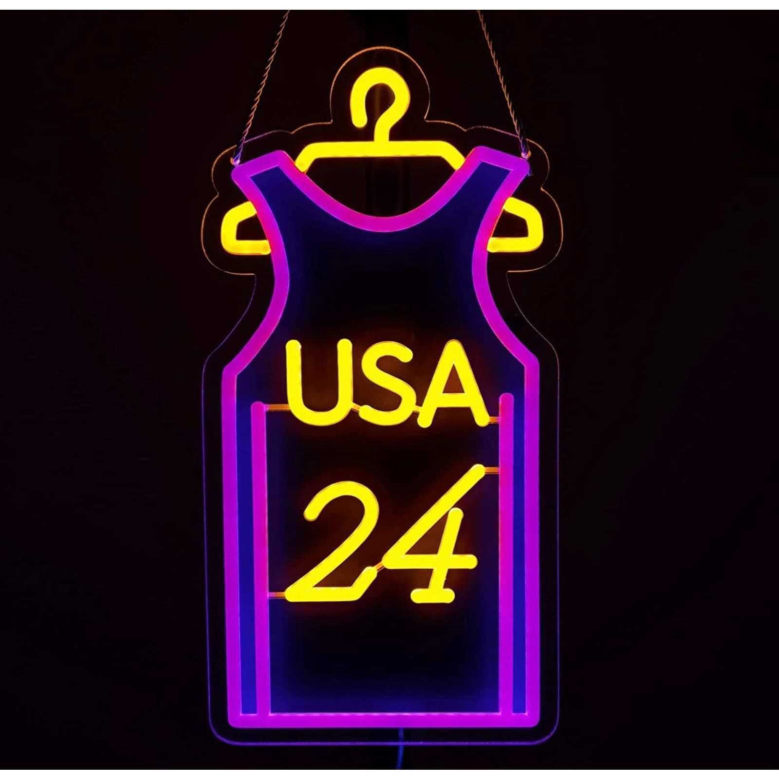 Jersey 24 neon sign has a switch button, there are two small holes on the top of the sign, you can use the included chain to hang it on the wall or shelf.