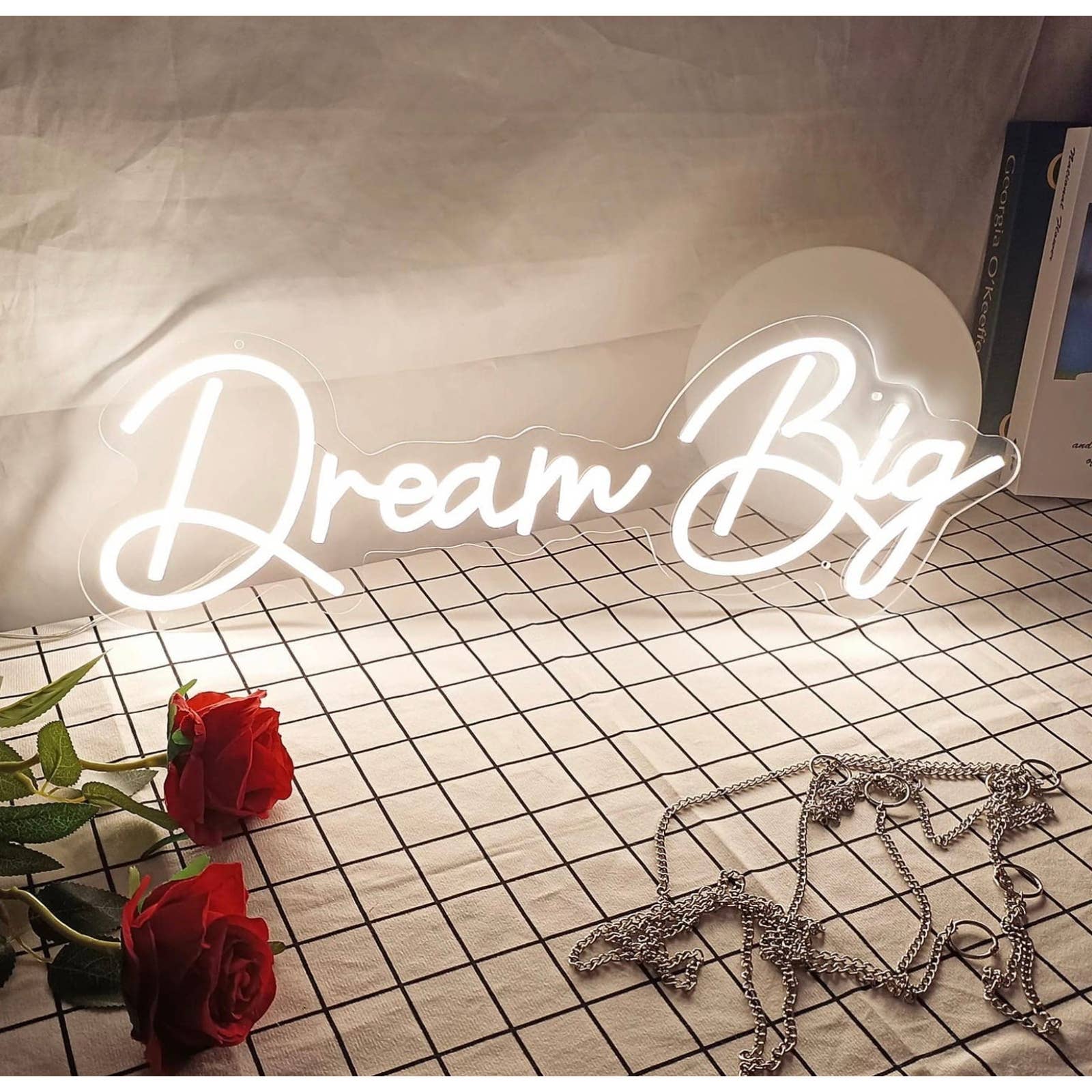 Easy to Use: Dream big neon sign, neon sign includes adapter, power cord, dimmer switch, chain, hanging ring, nail, LED neon sign is light weight, with small holes on the back panel, it can be easily installed, You can quickly hang or fasten it to a wall, or place it anywhere flat.