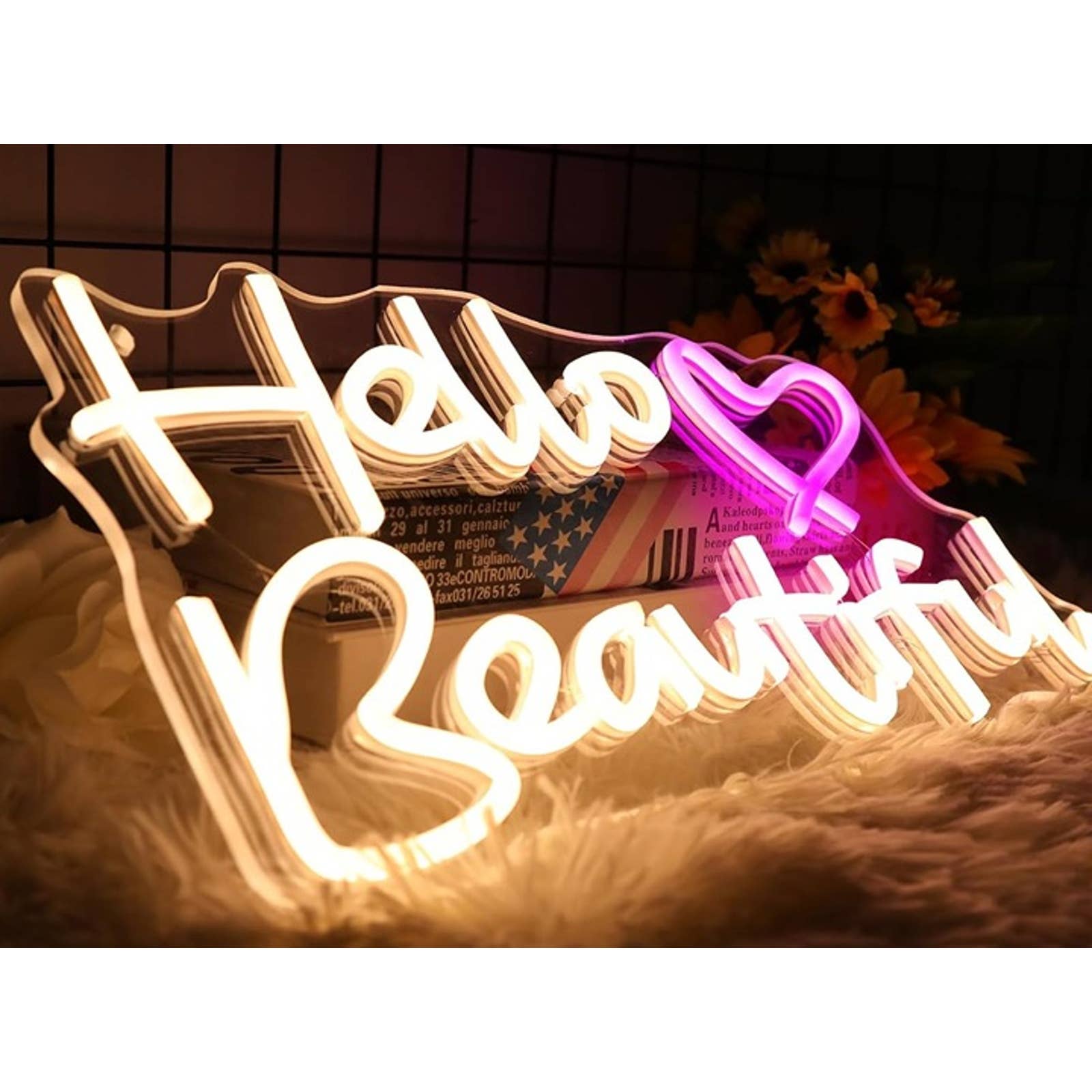 Brighten up your space with our Lovely Bright Pink Heart White "Hello Beautiful" LED Night Light!
