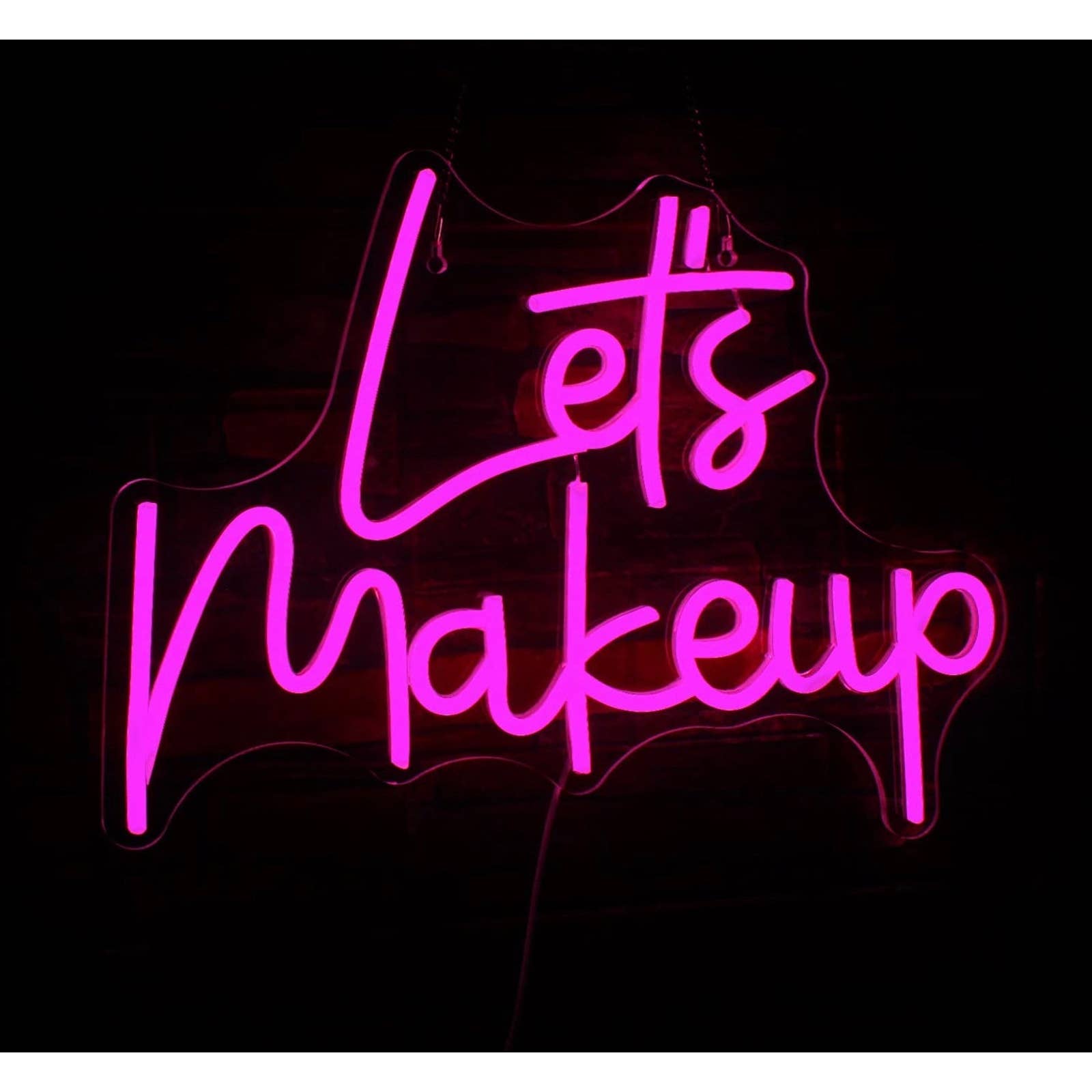 High Quality Neon Sign: Let’s makeup light sign is made of flexible silicone LED neon lights strips and thickened acrylic back plate. LED neon sign is bright, noise free and energy-saving. 5V low voltage advanced electrode system, low energy consumption and long life, no risk of too hot or glass damage.