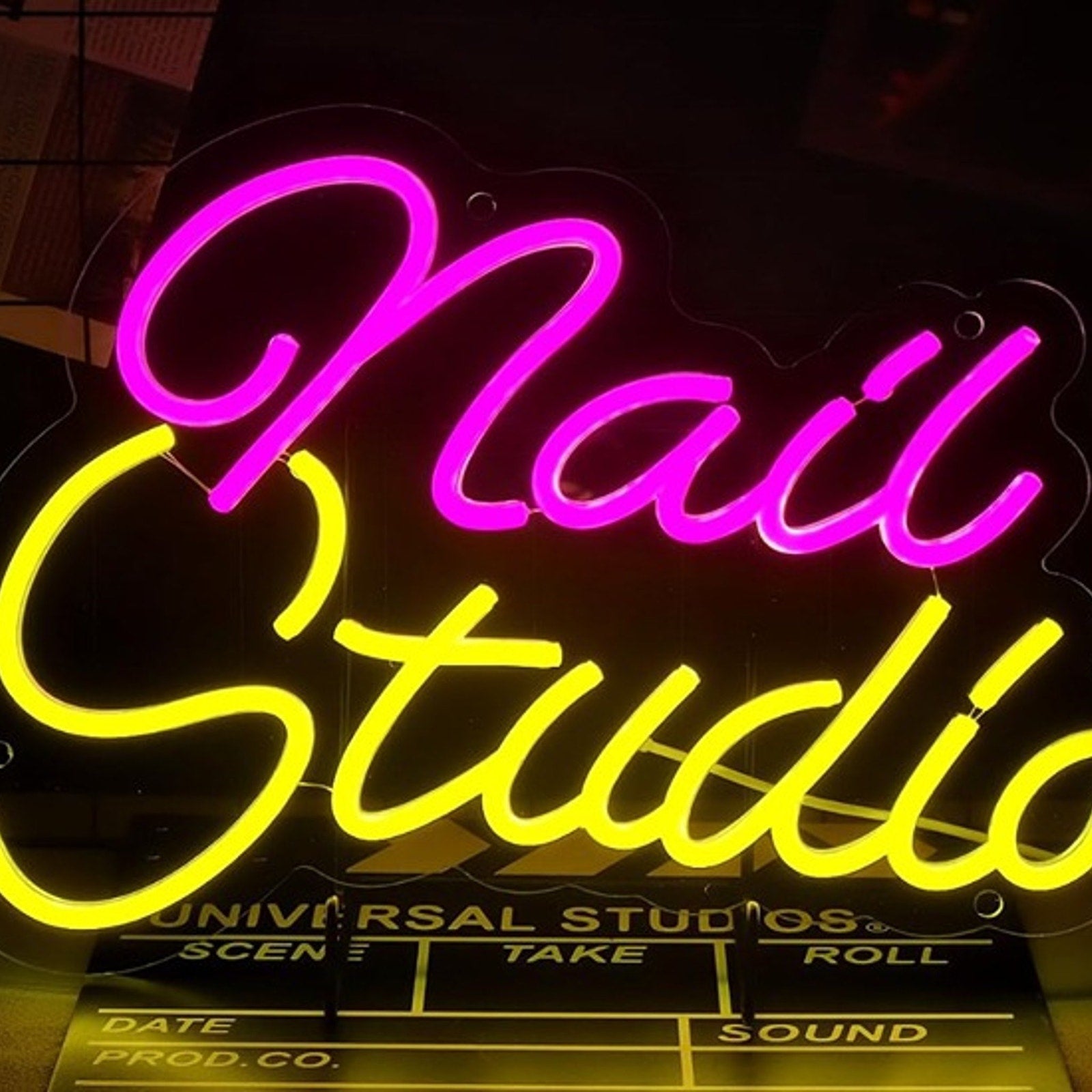 Add a vibrant glow to any nail salon or beauty space with this bright pink and yellow "Nail Studio" LED night light. Perfect for creating a stylish and welcoming atmosphere, this eye-catching sign enhances any spa, studio, or vanity setup. The sleek LED design offers energy efficient lighting, ensuring long lasting brilliance without overheating. A must have for nail artists, beauty lovers, and salon owners looking to elevate their décor with a fun, professional touch.