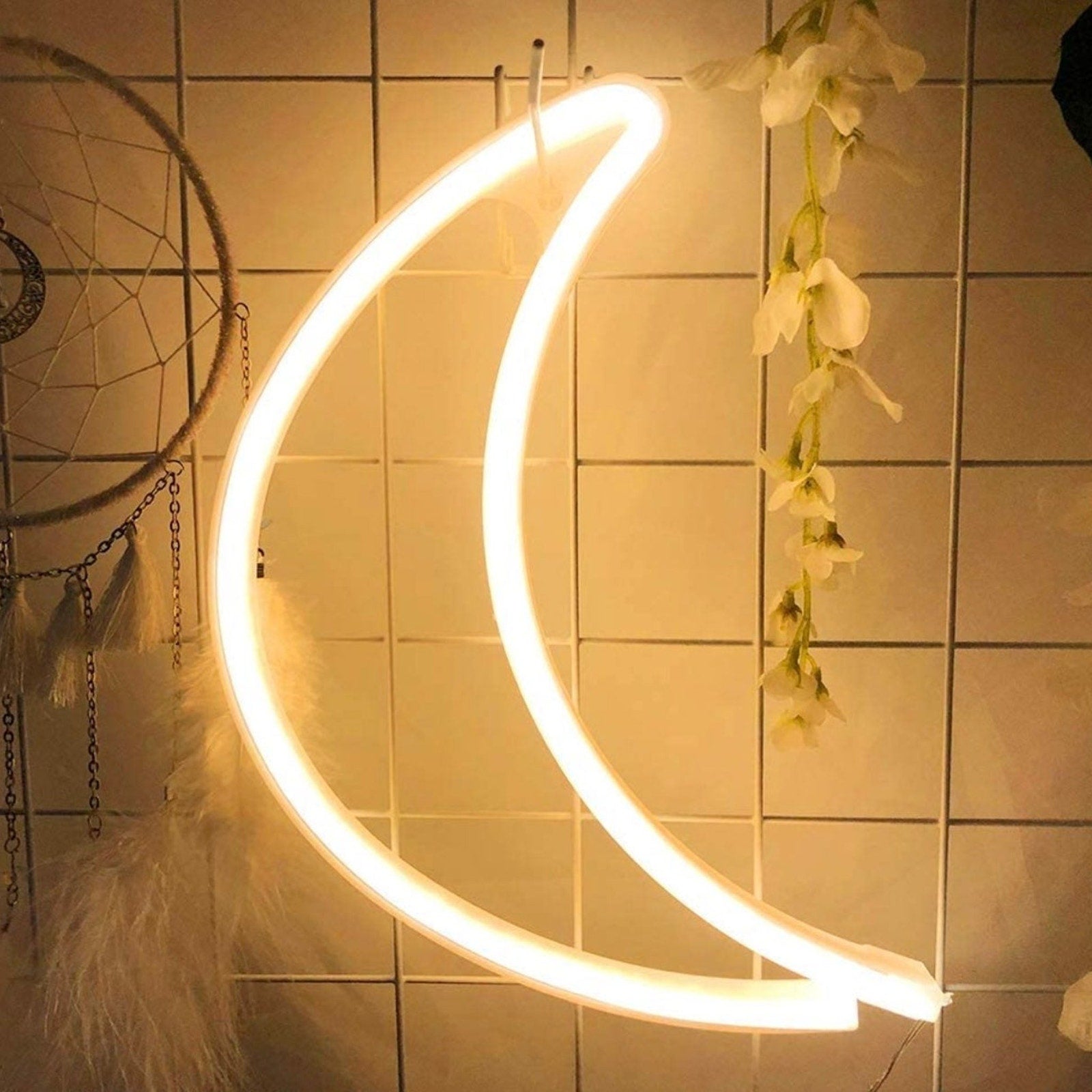 【ACRYLIC LED+SILICON STRIPS+ABS】LED moon neon signs use at low voltage and energy saving, light up neon light for room decoration. Neon sign made of flexible silicon LED strip lights and acrylic back plate, you do not have to worry about getting too hot, It is hazard-free, no risk of glass breakage or leakage of hazardous materials.