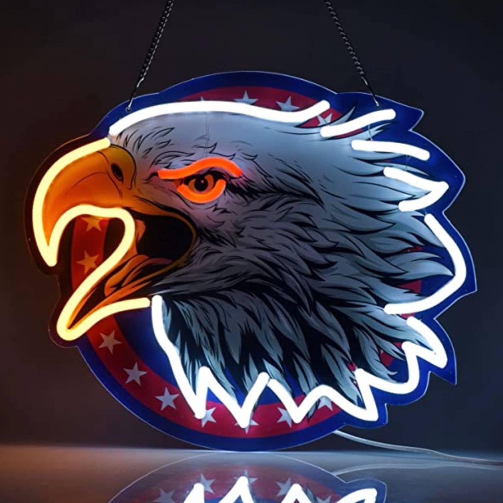 Cool design: Eagle neon sign. UV printing Eagle pattern combined with LED outline, a creative product brings fun to your life. Made of LED strip lights and clear acrylic board, come with a hanging chain. Well made and packed.