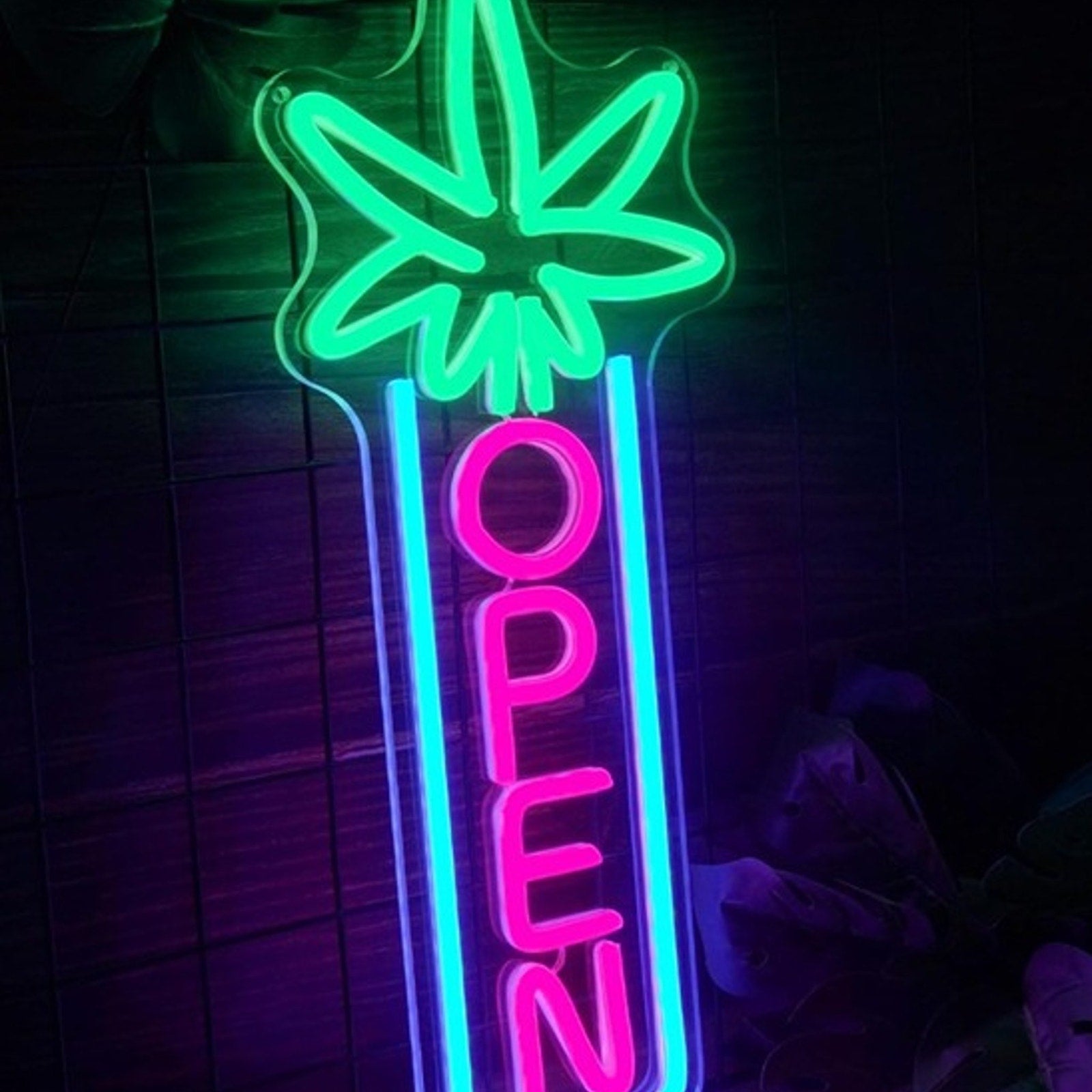 Light up any storefront with this eye-catching bright green vertical "Open" LED sign! Designed for businesses looking to stand out, this sign is perfect for dispensaries, cafes, smoke shops, and more. The vivid lighting ensures visibility day or night, attracting customers with a sleek and modern glow.